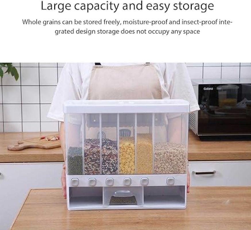 স্বতন্ত্র ডিজাইন: 4টি অভ্যন্তরীণ গ্রিড ইচ্ছামত সরানো যেতে পারে, এবং চালের বালতিটি বিভিন্ন শস্য যেমন ওটমিল, মটরশুটি, কফি বিন, শুকনো খাবার বা শস্য সংরক্ষণ করার জন্য পাঁচটি গ্রিডে বিভক্ত। আপনি গ্রিড অপসারণ করতে পারেন, বড় ক্ষমতা একটি একক খাদ্য ধরে রাখতে পারেন